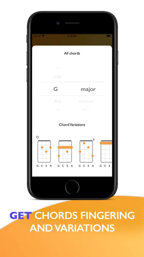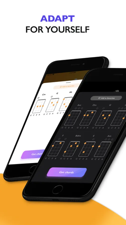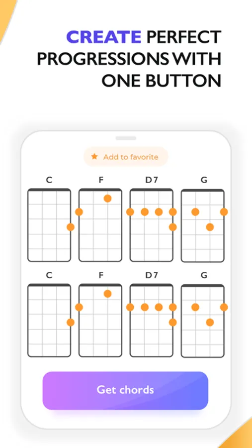 Just click the “Get Chords” button and the app will create a progression of chords that perfectly match with each other. Based on this, you can write a song or just practice on the ukulele, improving your skills. Our app. has special algorithms to which it creates a database of a huge number of different progressions. Therefore, you you can always find something new :)