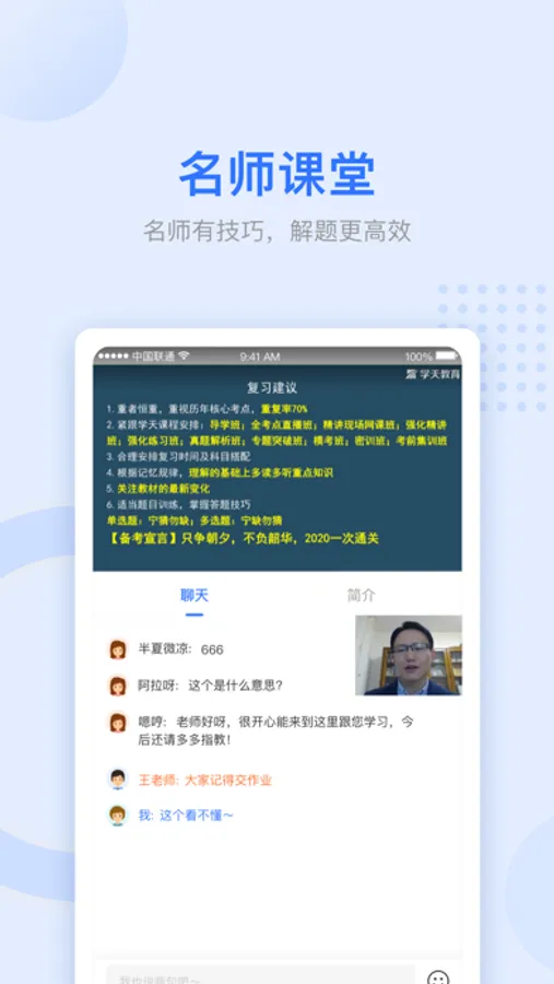 在线直播: 直播课堂,连麦互动,师生实时交流,考试难点逐一解析。