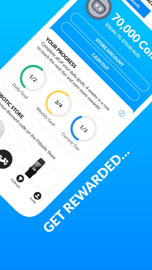 Earn rewards for completing daily and weekly exercise goals. Rewards Balance can be claimed as a discount to buy products through the Fitbotic store, or you can cash-out the credit as a PayPal deposit when you have earned $70 AUD credit or more!