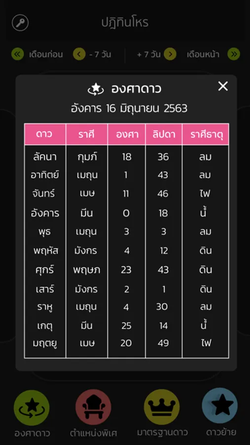 - แสดงตำแหน่งพิเศษต่างๆของดวงดาวในวันนั้นๆ เช่น เสี้ยวจันทร์ ตรีโกณ จตุสดัย ฯลฯ