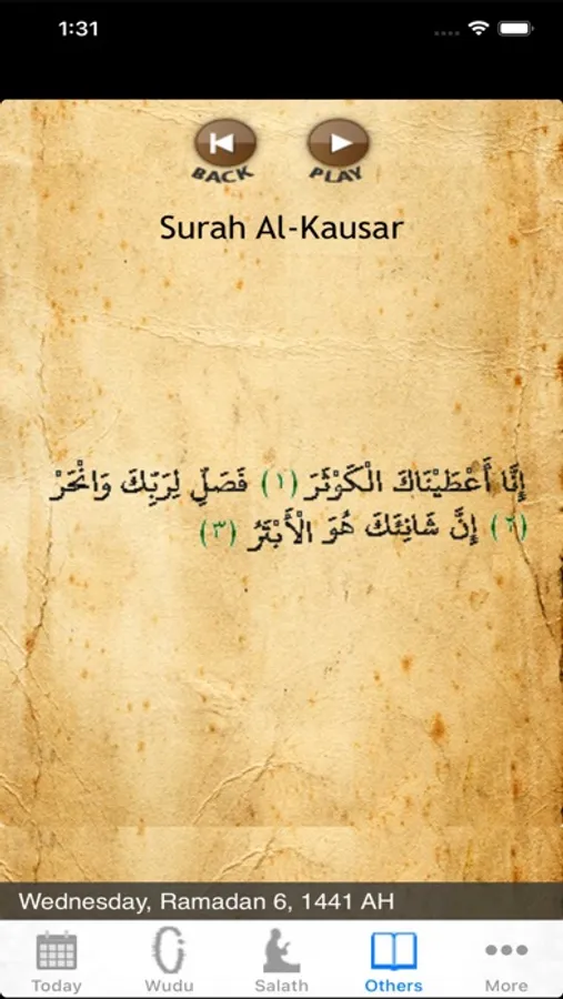This section provides some of the Surahs and Azaan in text and audio format. Transliteration is provided in English for users who cannot read Arabic.