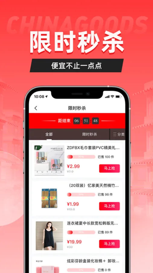 工艺饰品、节庆用品、童装母婴、玩具童车、美容化妆、个护家清、日用百货、厨卫用品、办公文教、钟表眼镜、服装内衣、鞋靴袜饰、体育娱乐、汽摩用品、针仿织品、宠物园艺、皮革箱包、辅料包装、数码家电、建材家装、机械五金、电工电子、食品生鲜、进口商品等全行业覆盖。