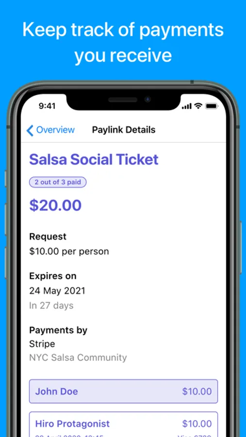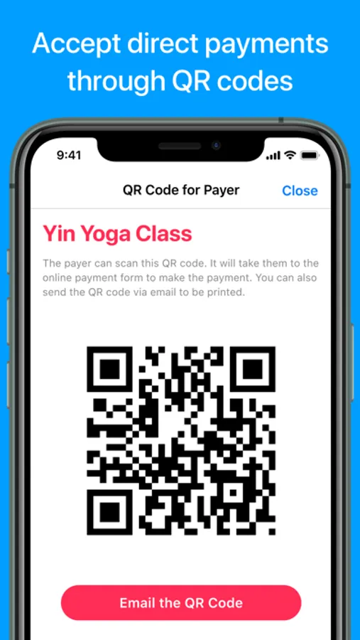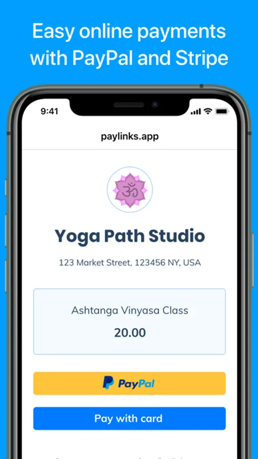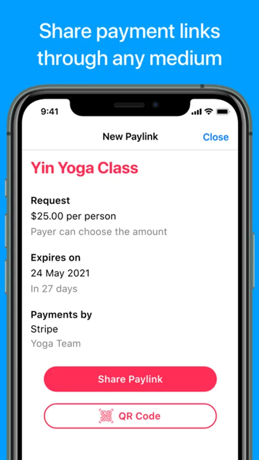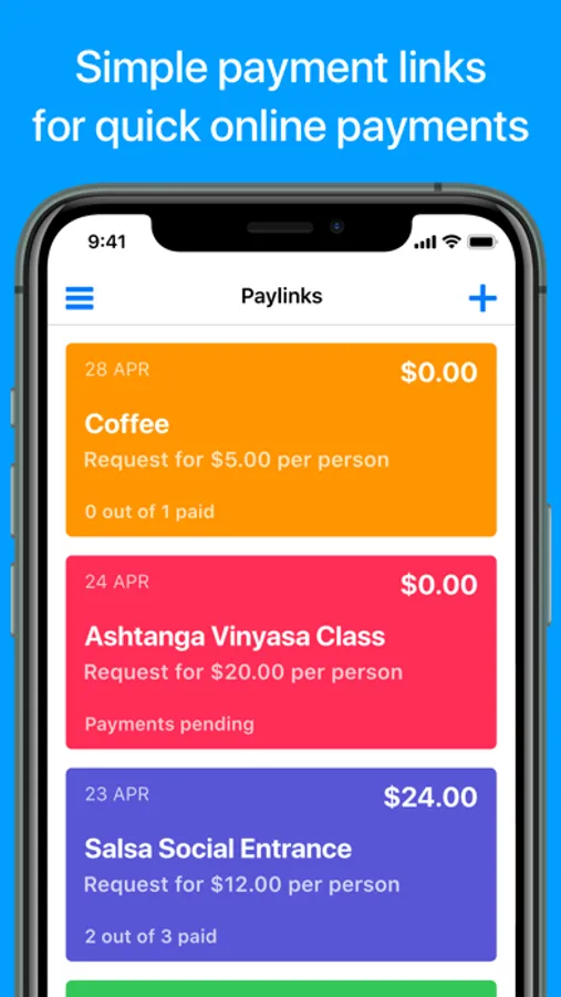 Paylinks is ideal for accepting small-value payments (such as for a yoga lesson or entry ticket to a social dance event): you don’t need any special device like a point-of-sale system or a payment terminal, and you don’t have to send invoices.