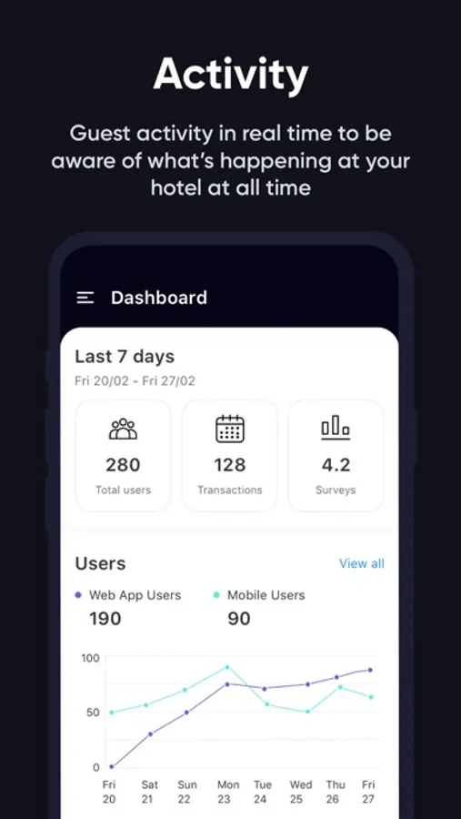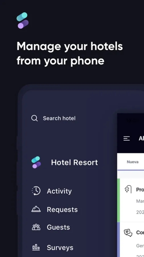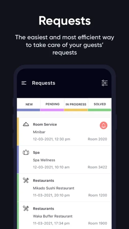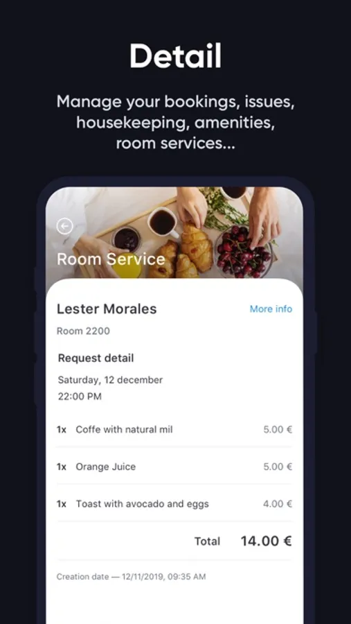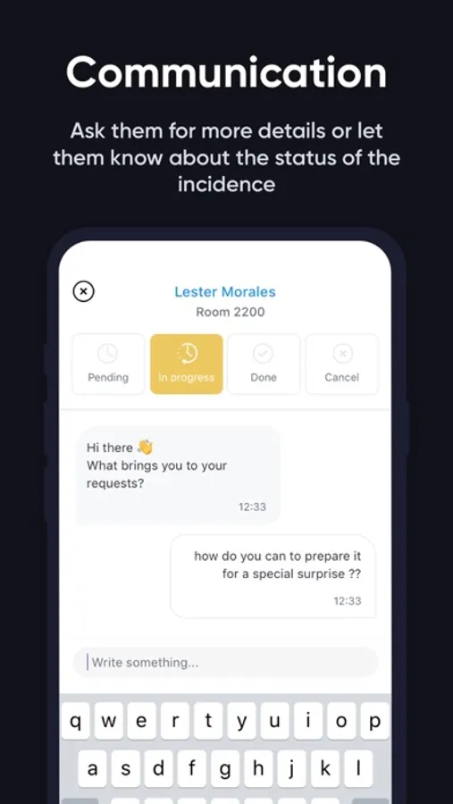 - Manage requests from your phone: bookings, issues, housekeeping, amenities, room service...
