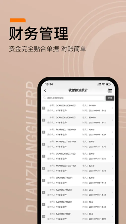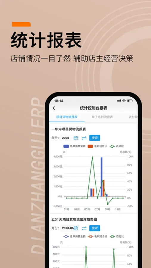 管钱流:管理收银付款,查看盈利盈亏、财务报表等;