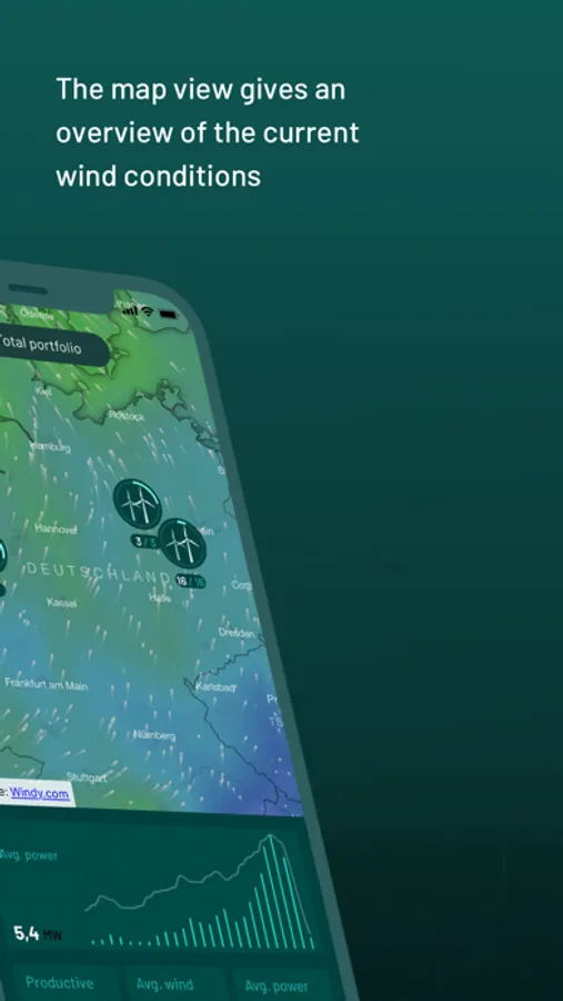 Wind farms and wind energy converters are displayed on a detailed smart wind map. This allows you to quickly record and analyse the wind conditions at different locations. You can access further information about your wind farms or wind energy converters directly from here.