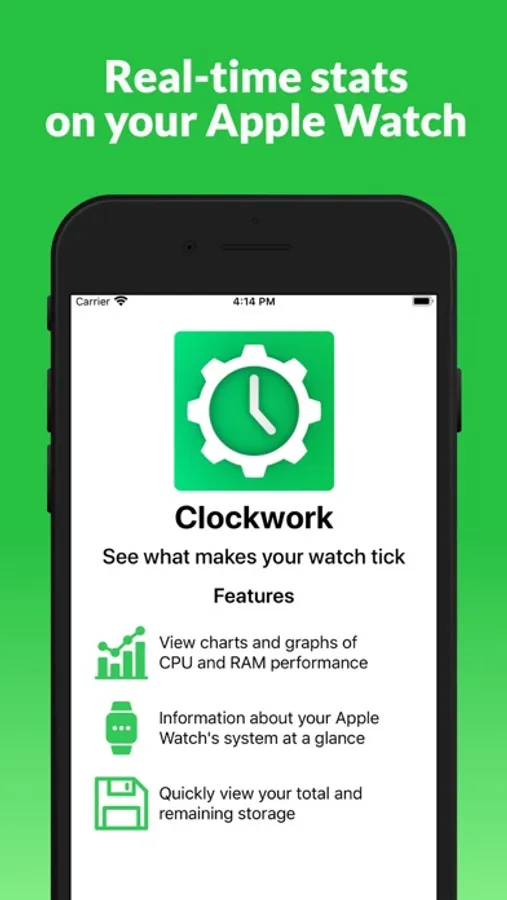 Clockwork is the #1 utility and developer app for your Apple Watch, bringing detailed resource statistics and system information to your wrist! View live CPU, RAM and Storage usage, system version information and watch capabilities, all in a simple and easy-to-use app. Complications allow you to have quick access to the app whenever and wherever you need.