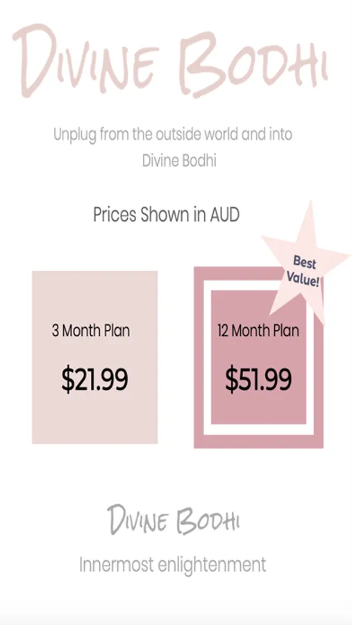 Purchase an auto renewing subscription with your iTunes account to get full access to all content the Divine Bodhi platform. Our plans include 3 monthly subscriptions at $21.99 and 12 month subscription for $51.99.