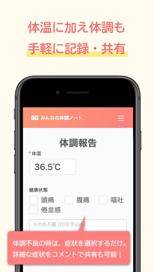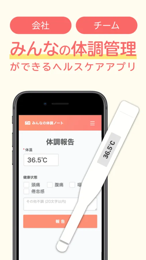 みんなの体調ノート for チームは、会社、学校、スポーツチームなど、複数人の体温体調の記録、共有、管理が簡単にできるヘルスケアアプリです。