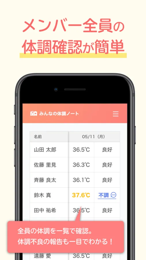 ・管理者は、共有されたメンバーの体温体調を一覧で確認。