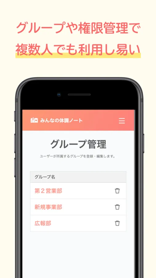 ・マネージャー:所属するグループのメンバーの体温体調の記録のみ閲覧可能。