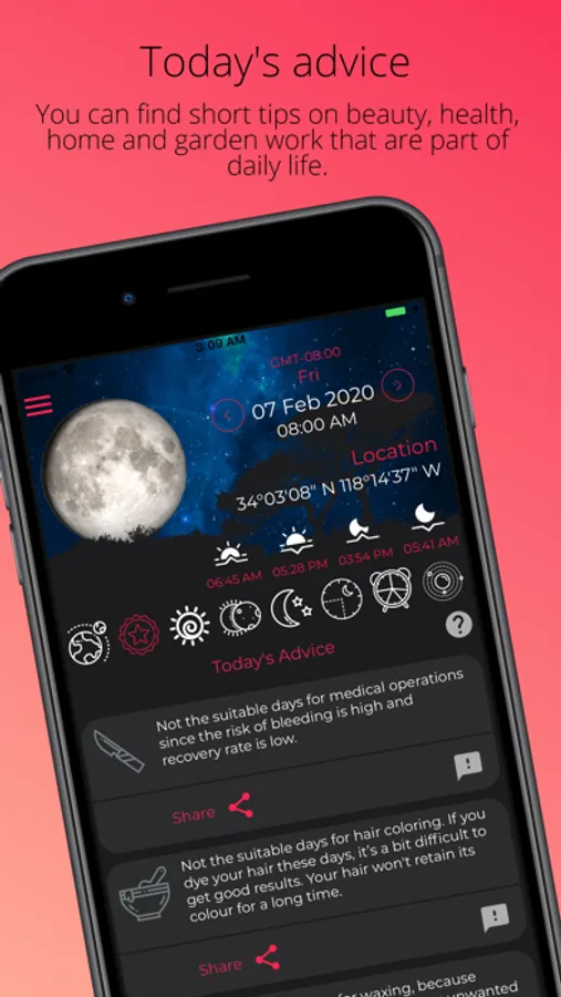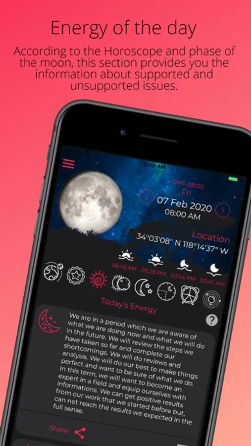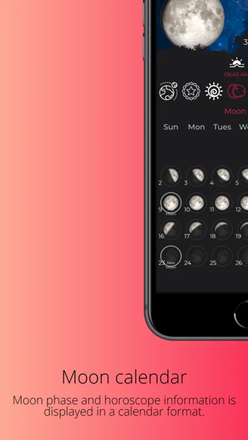 This app offers you information according to the Moon's horoscope and Moon Phase information. It provides the opportunity to follow the New Moon and the Full Moon. You may also easily follow Solar Eclipses and Moon Eclipses. In the application you may receive notifications about topics that interest you.