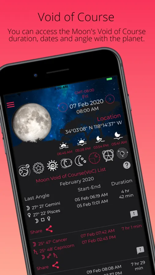 o Void of Course list (Voc): You may access, dates and angle with the planet. You can easily follow the Moon's Void of Course durations, which days it becomes to this position, how many hours it will last, and in which sign and in which planet angle it comes to this position.