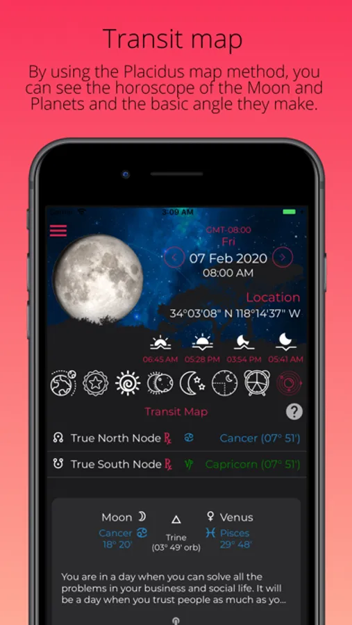 o Transit map: By using the Placidus Map method, you can see the horoscope of the Moon and the Sun and the base angle on the current map. You can also find explanations of how the angle between the Moon and other planets has an overall effect.