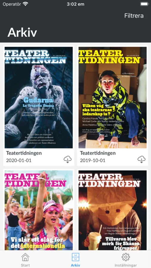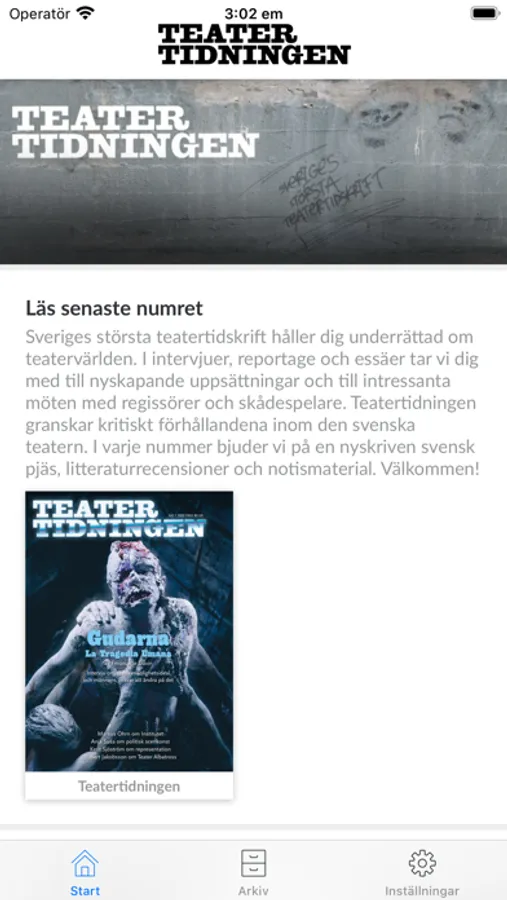 Sveriges största teatertidskrift håller dig underrättad om teatervärlden. I intervjuer, reportage och essäer tar vi dig med till nyskapande uppsättningar och till intressanta möten med regissörer och skådespelare. Teatertidningen granskar kritiskt förhållandena inom den svenska teatern. Under de senaste åren har vi uppmärksammats för våra belysande artiklar om kulturpolitik, hur strukturförändringar har påverkat teatrarnas konstnärliga arbete samt om teater och tro. I varje nummer bjuder vi på en nyskriven svensk pjäs, litteraturrecensioner och notismaterial.