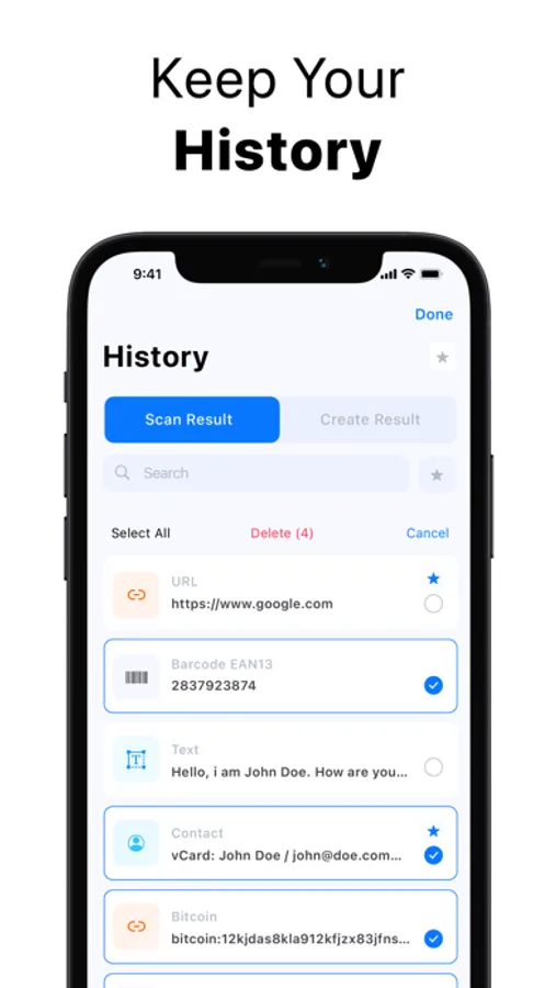 All scanned QR and barcodes are stored in your history. You can easily filter.
