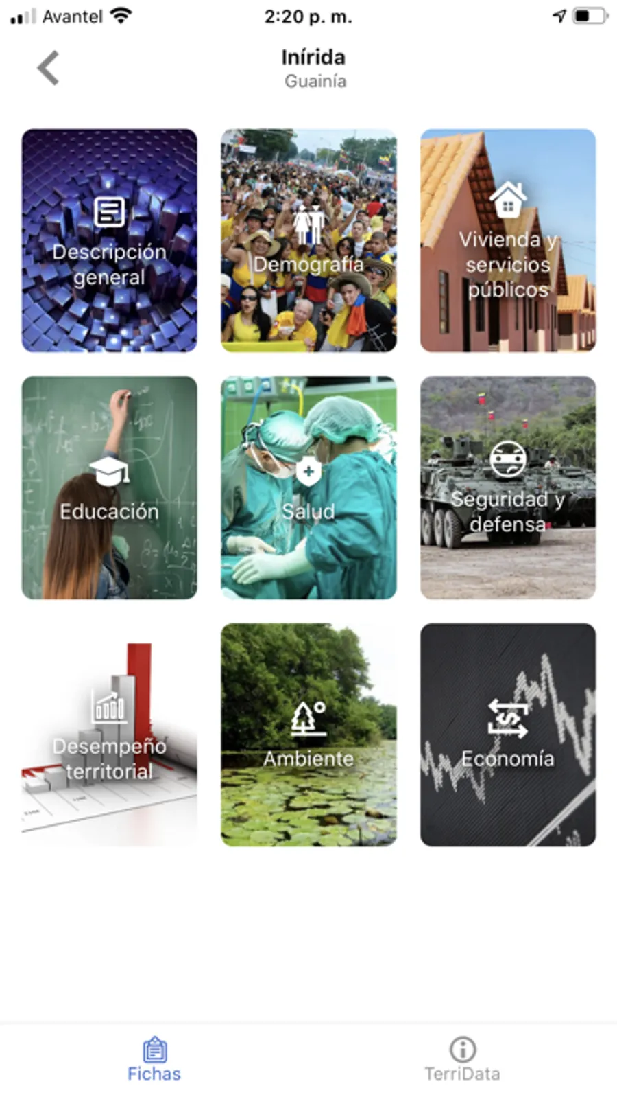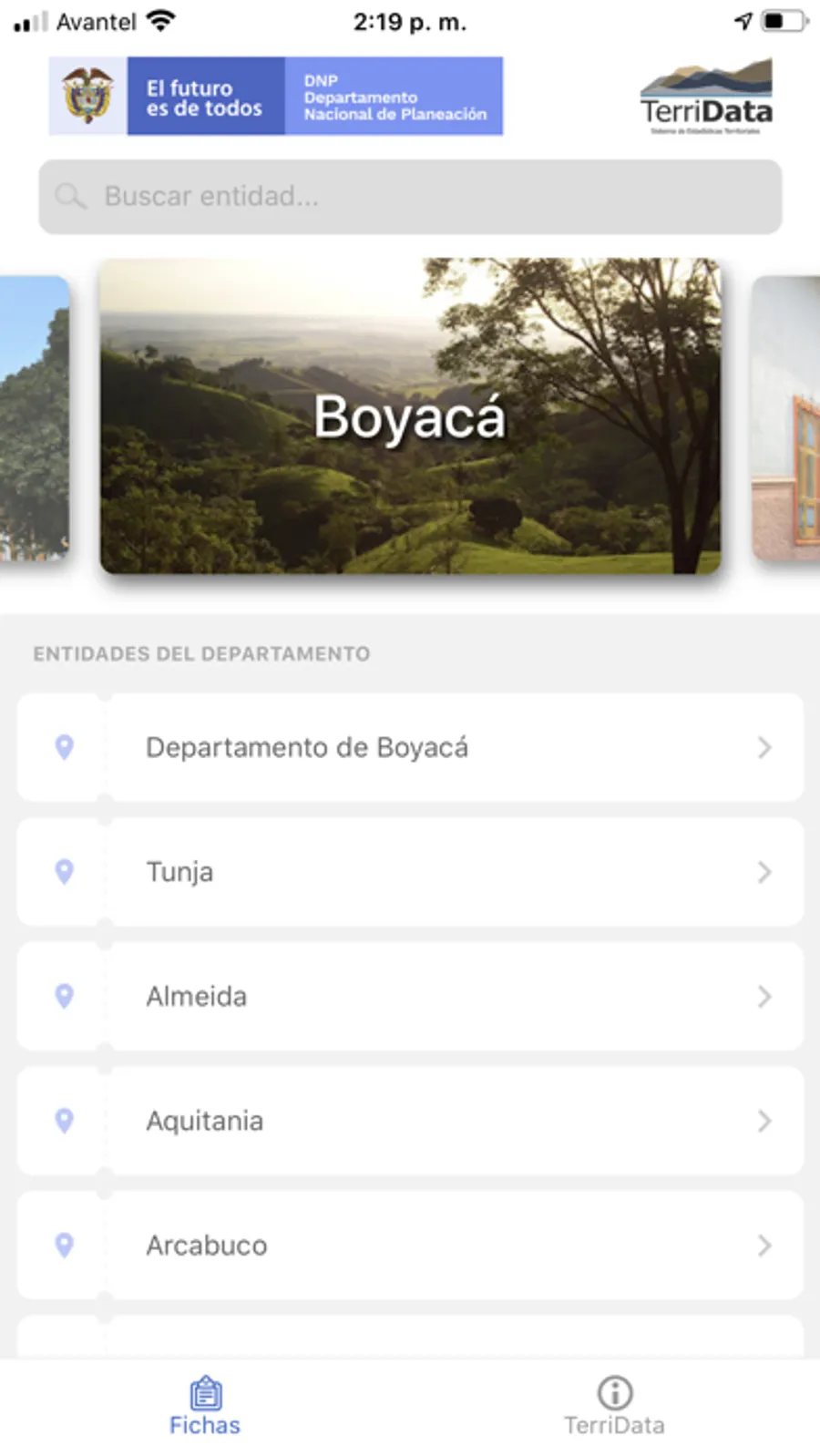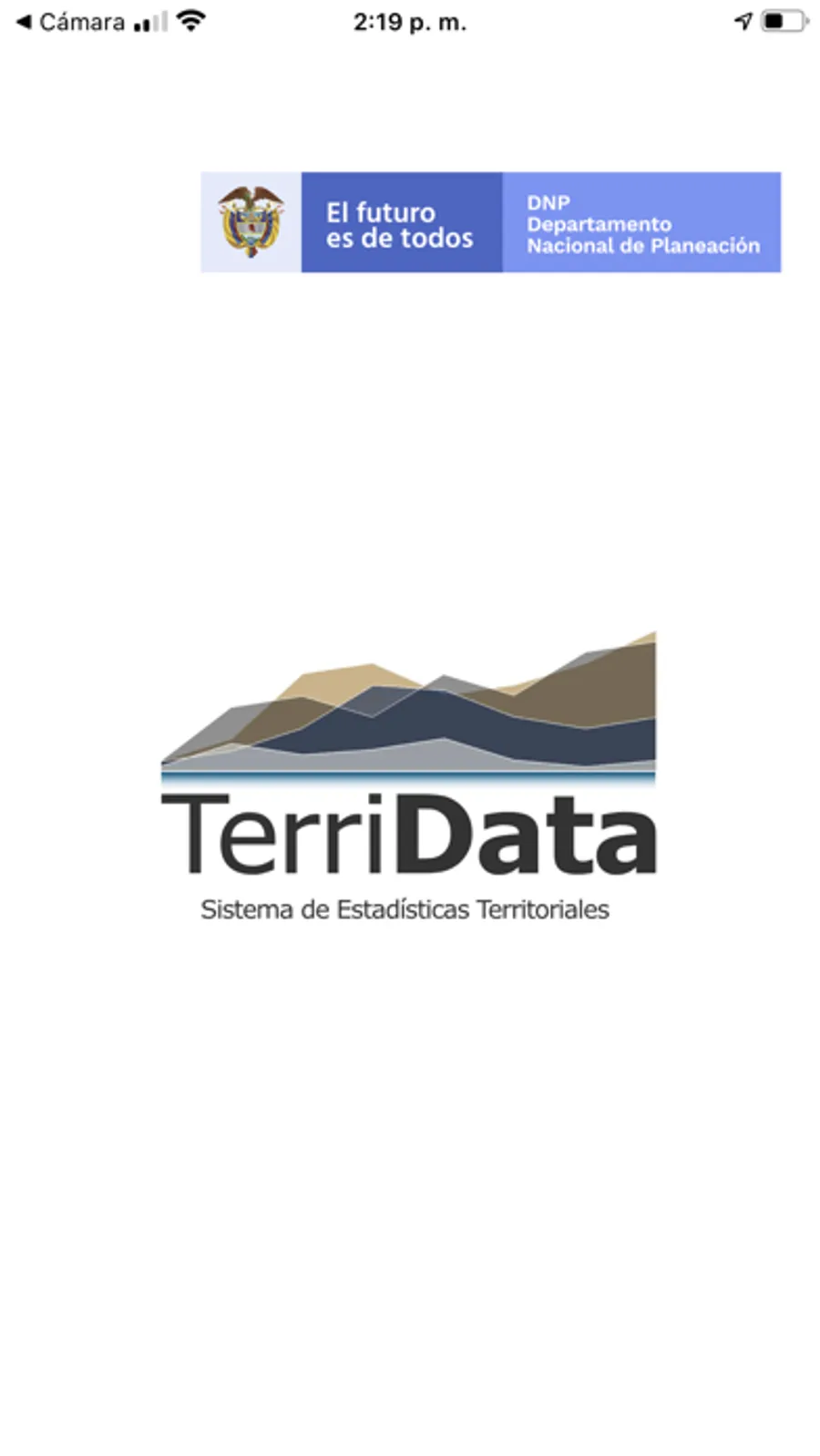 Esta es la versión móvil del Sistema de Estadísticas Territoriales - TerriData del Departamento Nacional de Planeación - DNP, herramienta para fortalecer la gestión pública, academia y participación ciudadana informada a partir de información estadística oficial y comparable para los 1.101 municipios y 32 de departamentos del país. Con la aplicación usted podrá consultar los indicadores más representativos de su municipio y/o departamento en materia de desarrollo económico, social y ambiental, y compartir las gráficas en sus redes sociales favoritas.