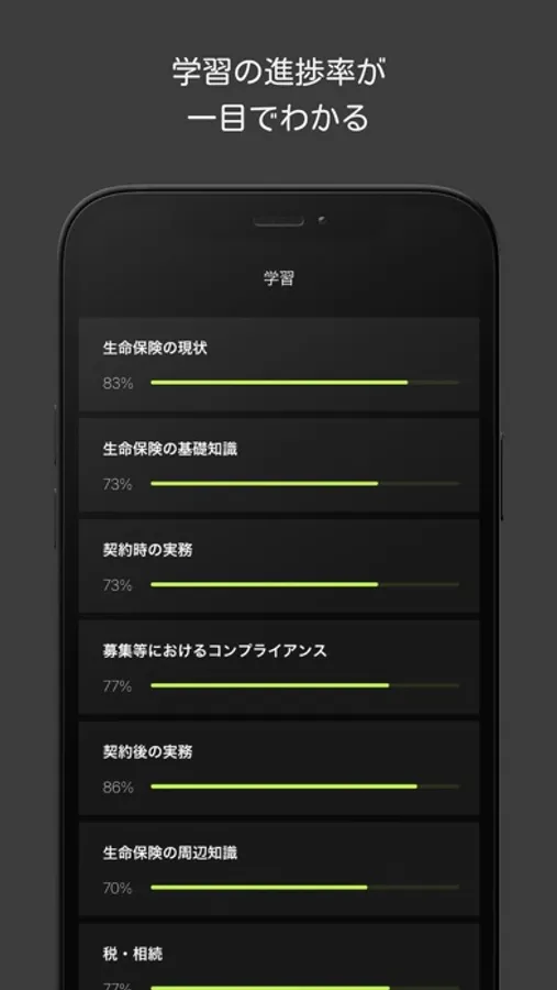 各問題には正解・不正解・未学習といったステータスが表示され、それらのステータスから算出される分野別の達成率をプログレスバーで簡単に確認できます。