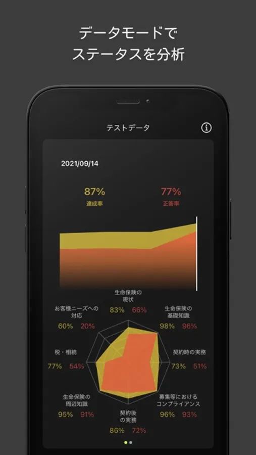 学習モードとテストモードの学習ステータスを分析し、数値やグラフを用いて効率的な学習をサポートします。