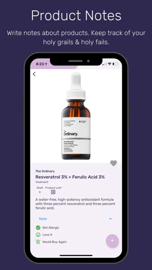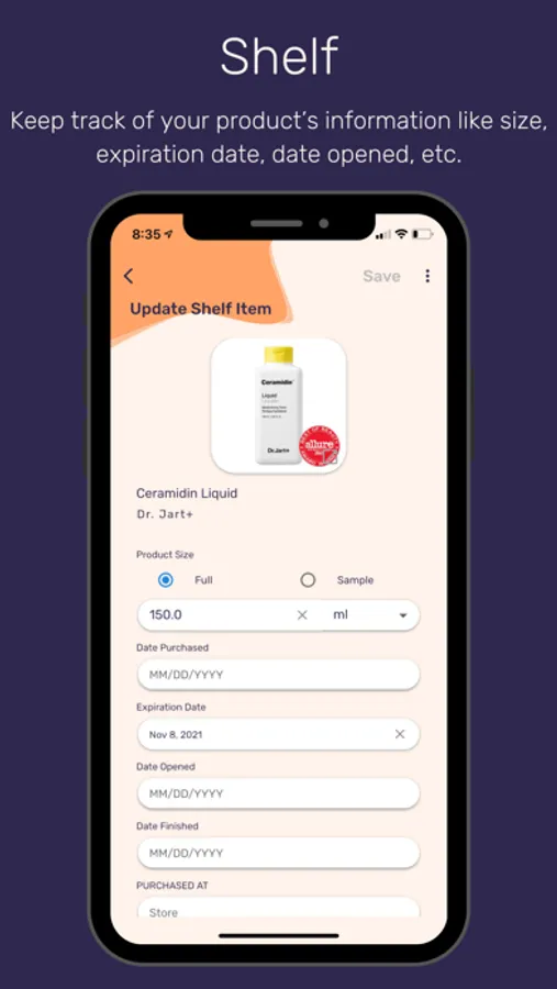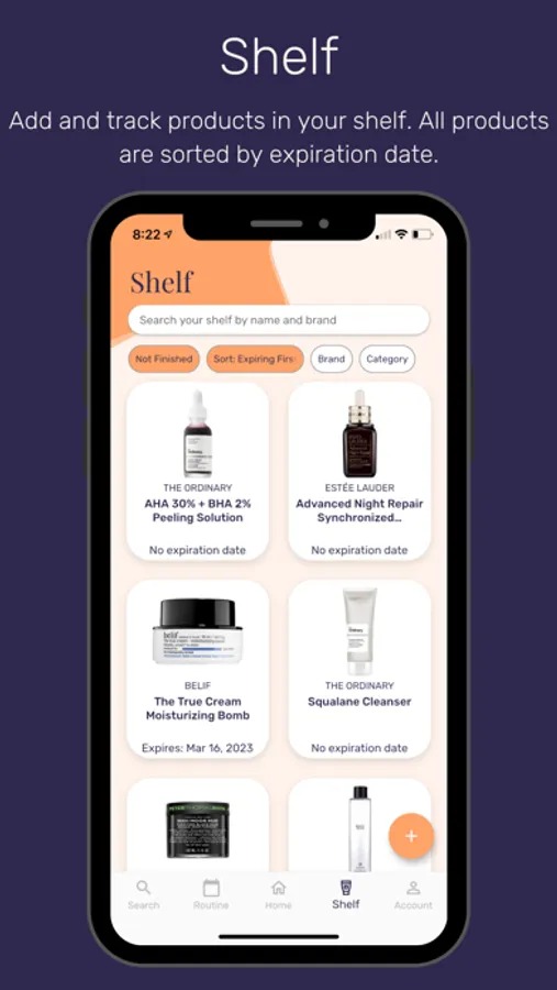 Shelf: Products in your shelf are automatically sorted by expiration date. Add products from our database. Track information about your products like expiration date, purchase date, date opened, size, purchase location, and date finished.