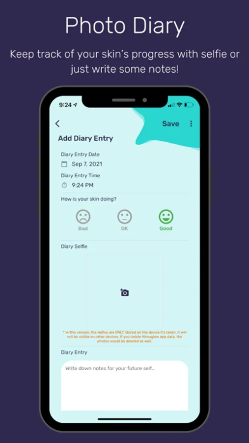 Diary / Selfie: Did you break out today for some reason? Add a diary entry and add a selfie. All routines and diary entries are kept under your account page for easy access.