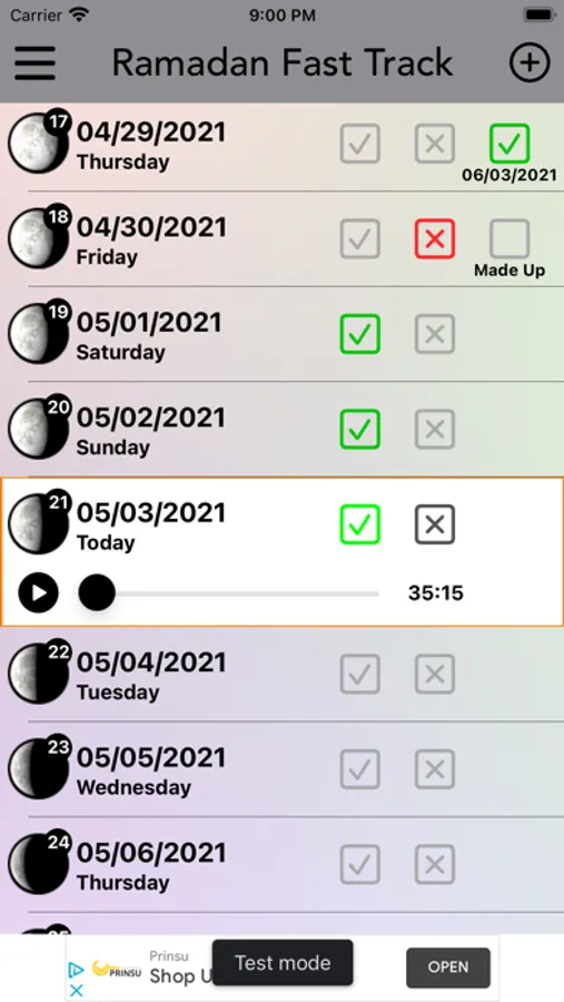 Ramadan Fast Track provides an intuitive, easy to use way of quickly seeing and capturing your fasting status. It also allows you to capture when missed fasting days are made up. No more guessing or forgetting. You can also quickly and easily see the estimated moon phase. Perfect for those who get sick, travel, etc.