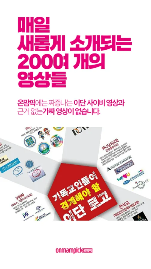 다양한 영상 플랫폼에서 신앙인들이 기독교 콘텐츠 검색시 일반적으로 사용하는 ‘기독교’, ‘성경’’ 과 같은 기독교 단어를 키워드로 검색하면 그 결과 다수의 이단 콘텐츠들에 무분별하게 노출되고 있지만 온맘픽에서는 신학적 이해와 건강한 신앙을 가지고 있는 목회자, 신학생, 신앙인으로 구성된전문 큐레이터들과 함께 적합한 기준의 콘텐츠를 선별하여 제공 합니다.