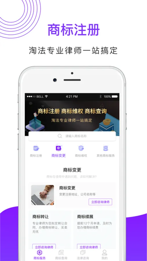【商标服务】提供商标查询,商标注册,商标设计,商标申请服务,同时提供国际商标、商标维权、商标无效、商标驳回复审、商标异议、商标转让、商标买卖、商标续展、商标变更、商标撤销等业务在线咨询。在商标使用过程中遇到的各种侵权及维权问题均可以咨询我们的app在线顾问或者直接电话联系我们的专业人员。