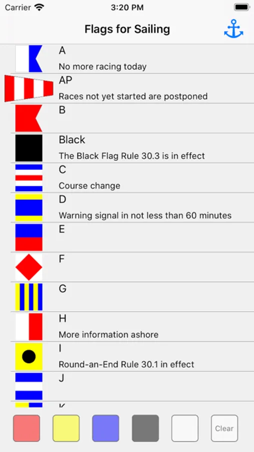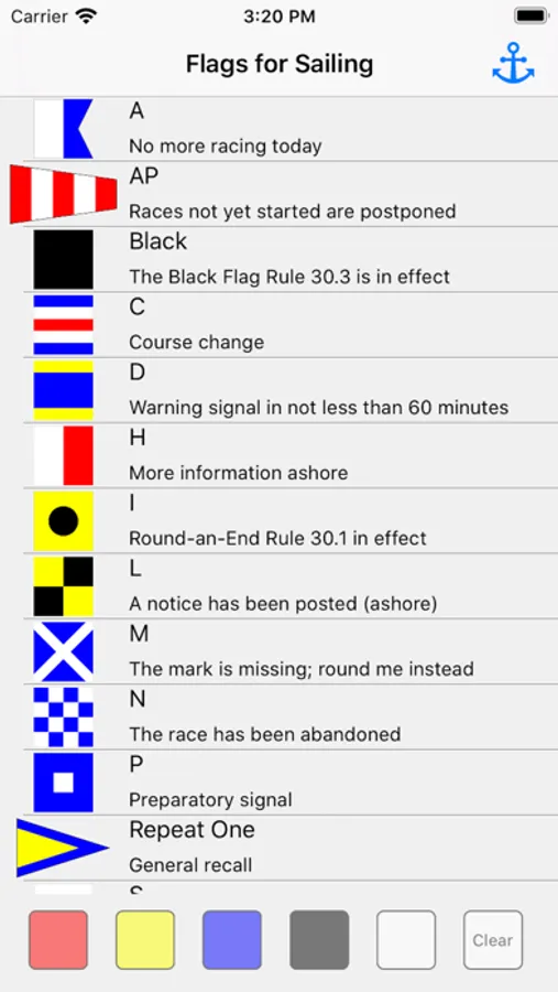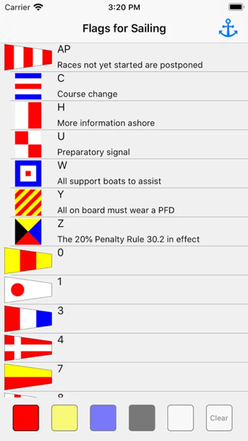 Flags for Sailing displays a list of the common signal flags and pennants that are raised during yacht racing regattas, along with a brief description. Each flag includes a more detailed description plus the International Code of Signals (ISAF) interpretation. The list of flags can be filtered by colour to instantly find the flag you're looking for.