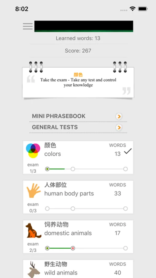 - Testing of the knowledge of the words happens through fun and simple tests: