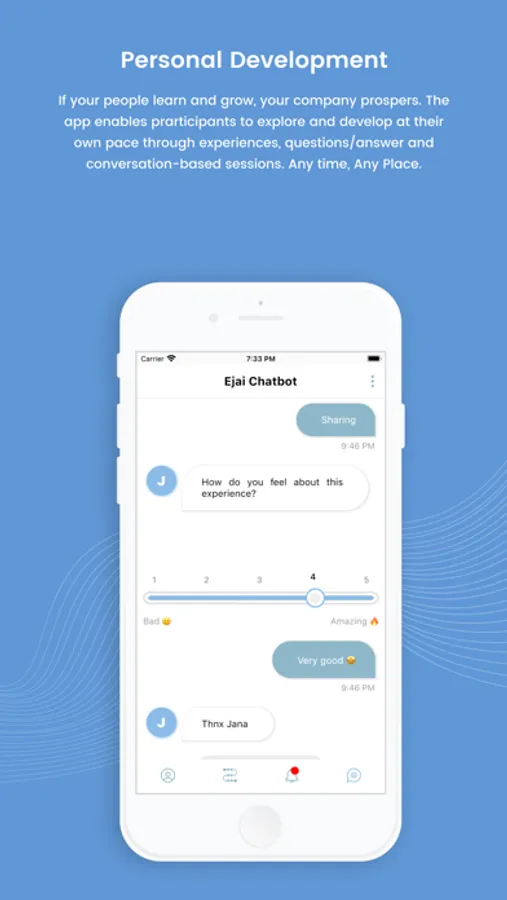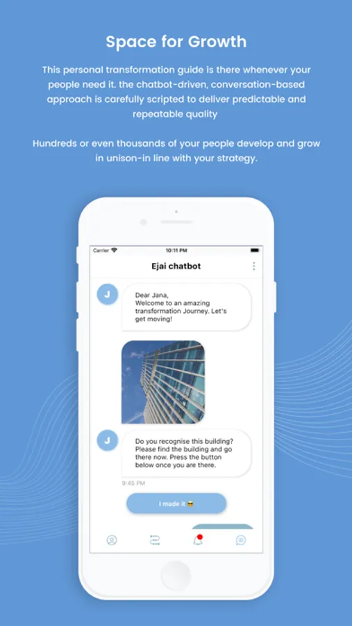 This personal transformation guide is there whenever your people need it. The chatbot-driven, conversation-based approach is carefully scripted to deliver predictable and repeatable quality.It allows participants to work at their own pace, while making sure hundreds or even thousands of your people develop and grow in unison – in line with your strategy.