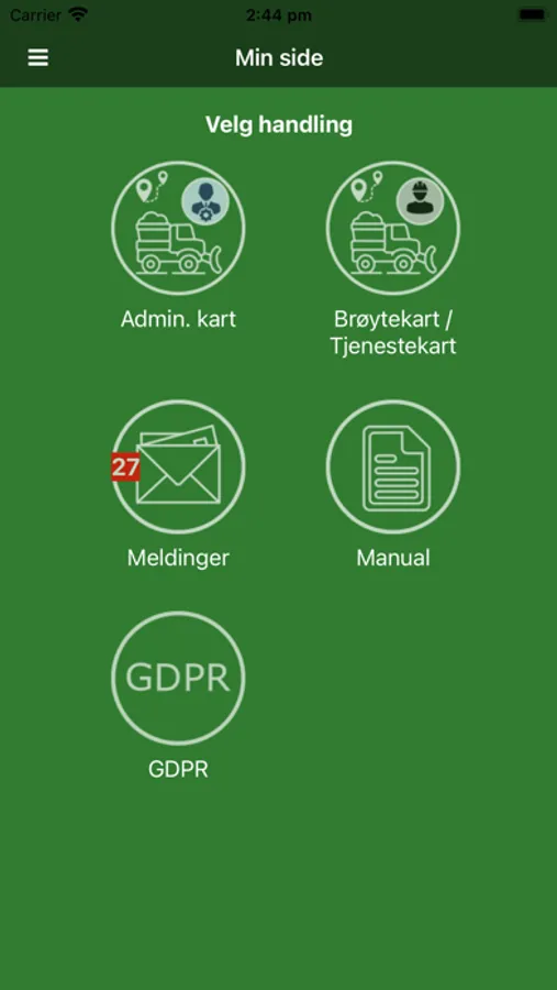 HovedsidenI hovedsiden ser du en oversikt over alle karttjenestene som er aktivert for brøytefirmaet/tjenesteleverandøren.I tillegg til disse karttjenestene, finnes det en intern meldingstjeneste for kommunikasjon mellom brøyter og leverandør samt en brukermanual. Disse finner du på hovedsiden.