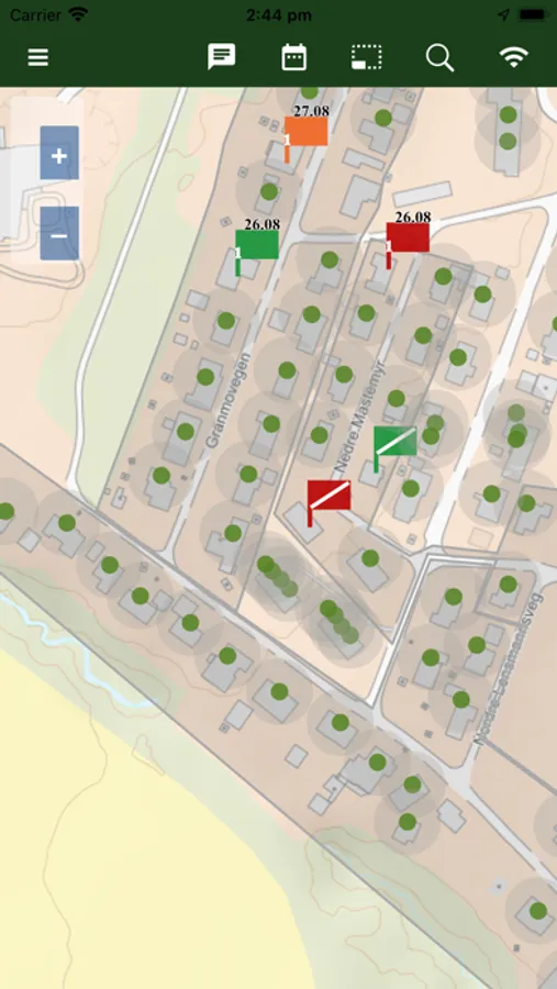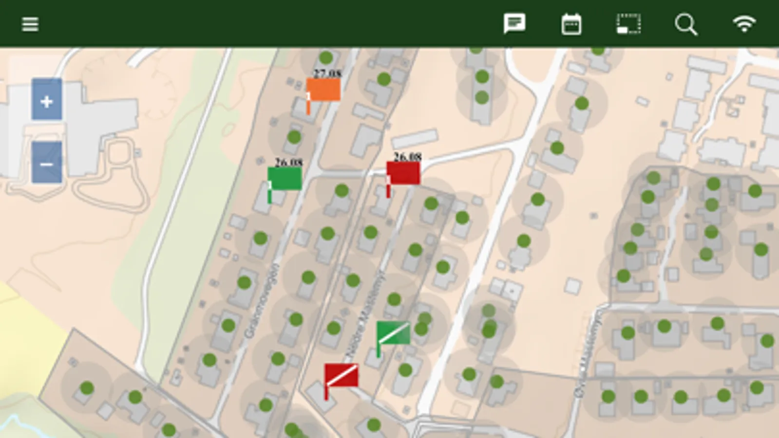 Du kan søke opp navn, mobilnummer og hytteadresse ved å klikke på ikonet i midten av de tre ikonene oppe på høyre side. Dette ikonet har bilde av et forstørrelsesglass.Du kan sjekke nettverkstatus ved å klikke på ikonet på høyre side av de tre ikonene oppe på høyre side. Dette ikonet har tre buede horisontale streker.