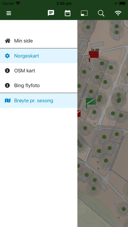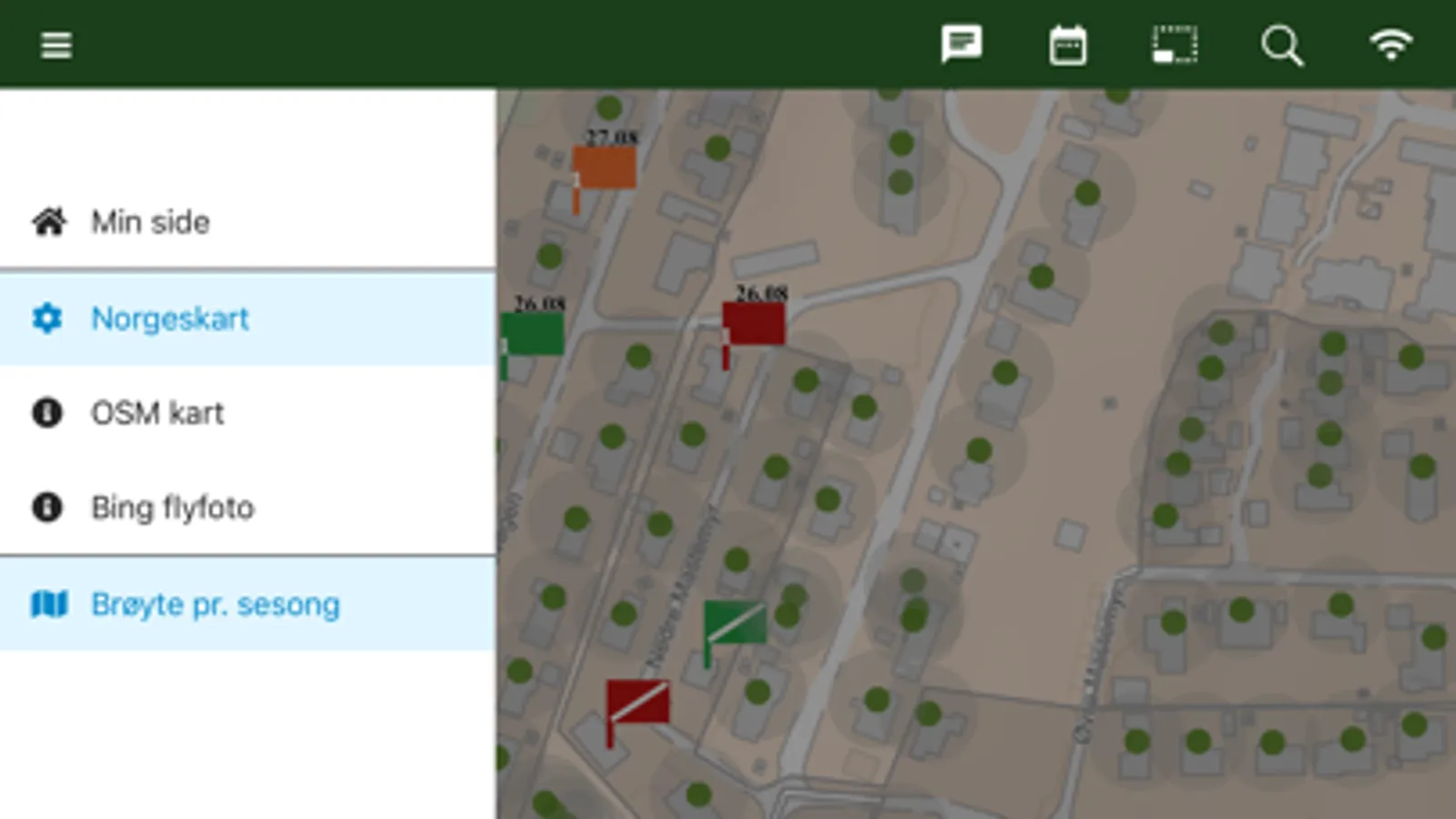 I sidemenyen i brøytekartet kan du veksle mellom tre forskjellige kartlag: norgeskart, Open Street Map og Bing. Alt etter smak og behag.I sidemenyen i brøytekartet kan du bytte mellom de forskjellige karttjenestene. Antall tilgjengelige karttjenester avhenger av hvor mange karttjenester som er aktivert hos tjenesteleverandøren.