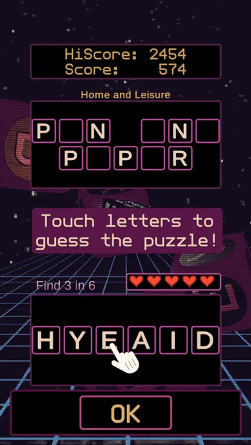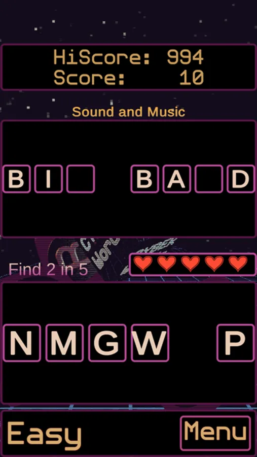 Game will give you a set of 6 letters, where 3 letters are from the puzzle and 3 are not. Pick correct ones and you will get a new set, until you solve the puzzle or run out of lives.