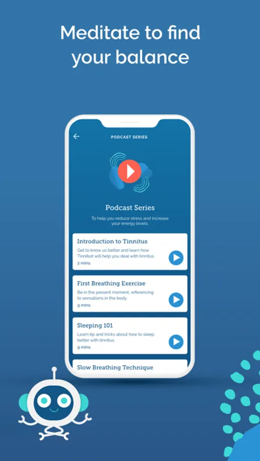 Tinnibot emphasizes mindfulness. Meditation and relaxation are cornerstones of a sound mind. Tinnibot has a range of relaxation techniques and breathing exercises for you to try out.