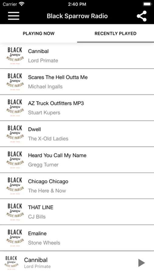 Black Sparrow Radio is created by and broadcast out of Black Sparrow Music Parlor, a musician-first music venue. BSR plays songs directly submitted by independent artists.