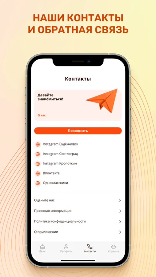 Также вы можете оставить отзыв по мобильному приложению, по качеству продукции и обслуживания в ресторанах.