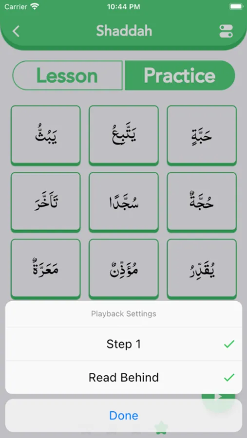 There are two modes included: A listen only mode to go through complete lesson without pauses, And a read behind mode for practicing pronunciation at run time.