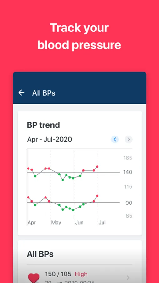 Keep track of your blood pressure with simple blood pressure recordings. See your overall health trend in a graph and assess your current health with easy-to-read labels.
