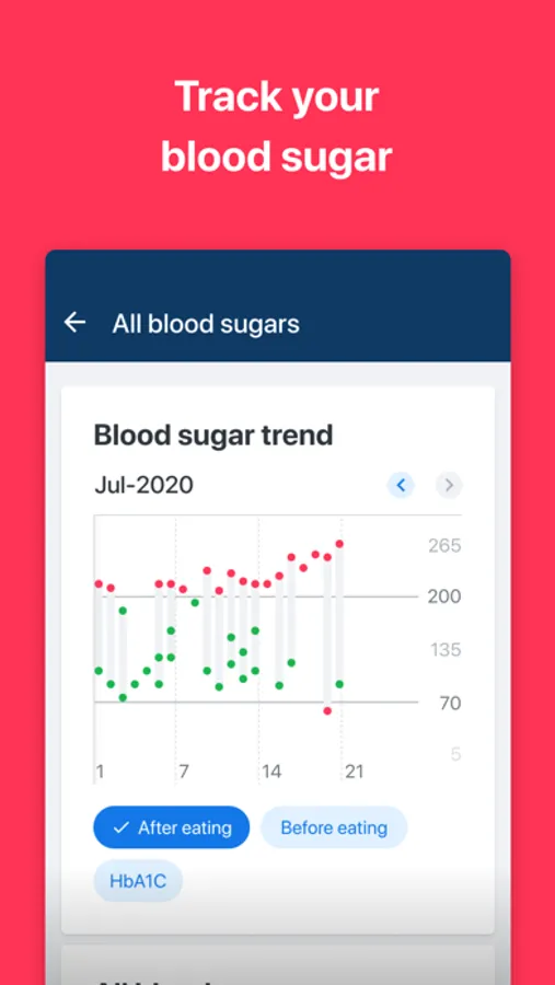 Keep track of your blood sugar with simple blood sugar recordings. See your overall health trend in a graph and assess your current health with easy-to-read labels.