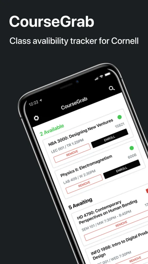 CourseGrab enhances the student enrollment experience by notifying students of available spots in courses they wish to enroll in. CourseGrab currently caters to Cornell University’s class roster. The key features of the application include: