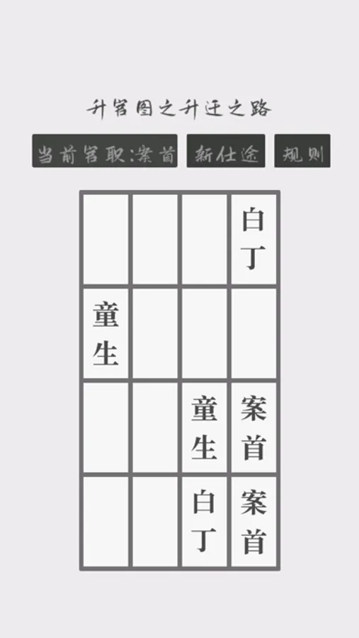 本游戏以升官图中官职升迁为背景,融合2048的玩法。