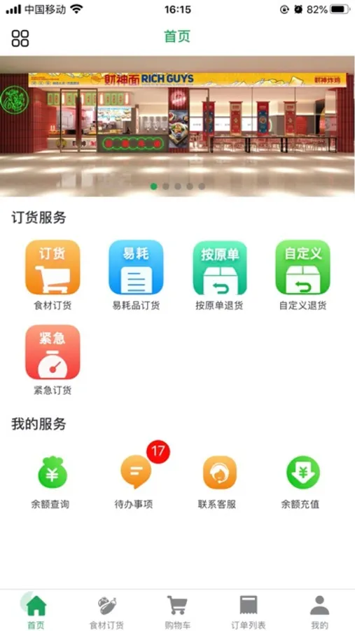 加盟门店登录APP,首页面展示日常订货、紧急订货、商品退货、订单查询、信用查询、待办消息查询的快捷入口,并与顶部展示企业的促销轮播图