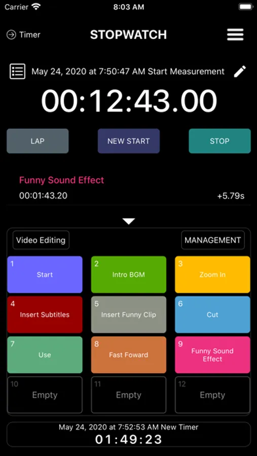 In ⌜StopWatchA⌟, you can create various buttons yourself to conveniently measure time and measure multiple times simultaneously.