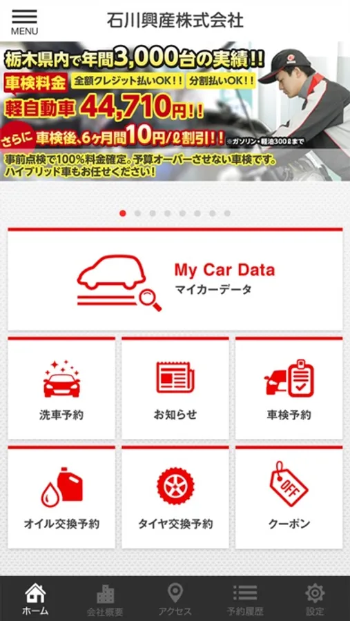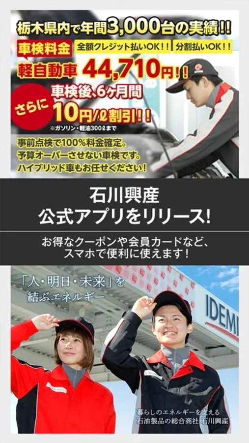 石川興産の公式アプリでは、お得な情報やクーポンの受け取り、車検や一般整備など各種メンテナンスのご予約が可能です!お得に便利にご利用ください。