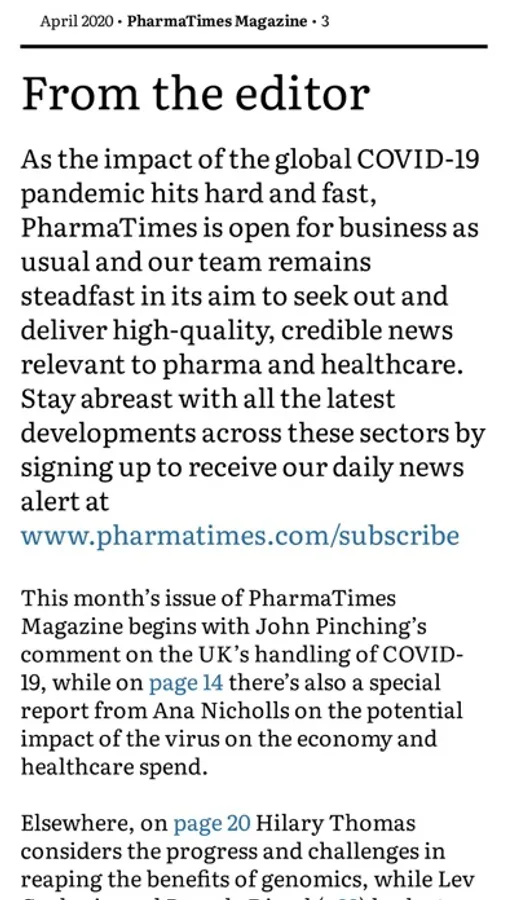 Why not subscribe to PharmaTimes in paper or print, or to sign up for our industry-leading daily and weekly news elerts.
