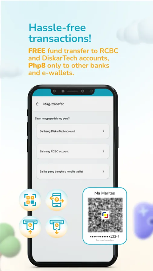 ● Transfer funds for as low as Php 8 (but free for DiskarTech to DiskarTech and RCBC to DiskarTech or vice versa transactions)