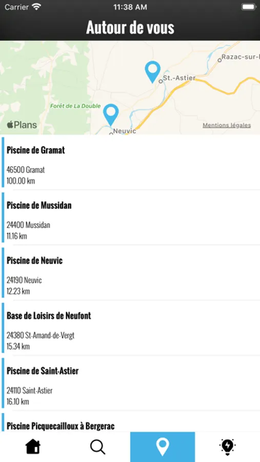 Vous pouvez rechercher les piscines par géolocalisation, par région ou sur une carte.