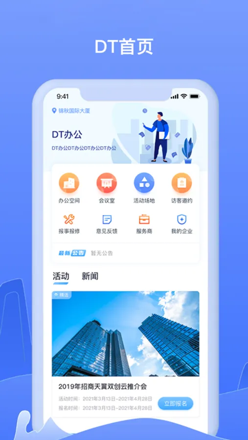 [智能门禁]- 不用多带一张卡,不用为刷脸刷指纹而烦恼,DT办公App让您通过手机自动开门。只要打开App扫描二维码就可以进门了。全球最领先的开门方式就在DT办公。